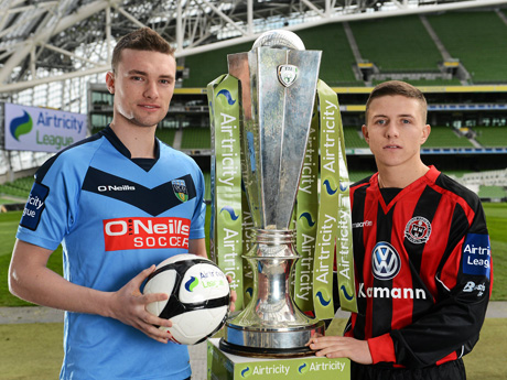 (Pic: UCD’s Michael Leahy and Bohs winger Keith Buckley at last week’s Airtricity League launch at the Aviva Stadium)