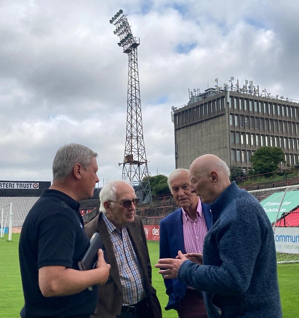 Bohemians manager Keith Long with Bohs heroes of the 1970s – Billy Young, Turlough O’Connor and Tony O’Connell – at Dalymount Park earlier this week (Luke O’Riordan)